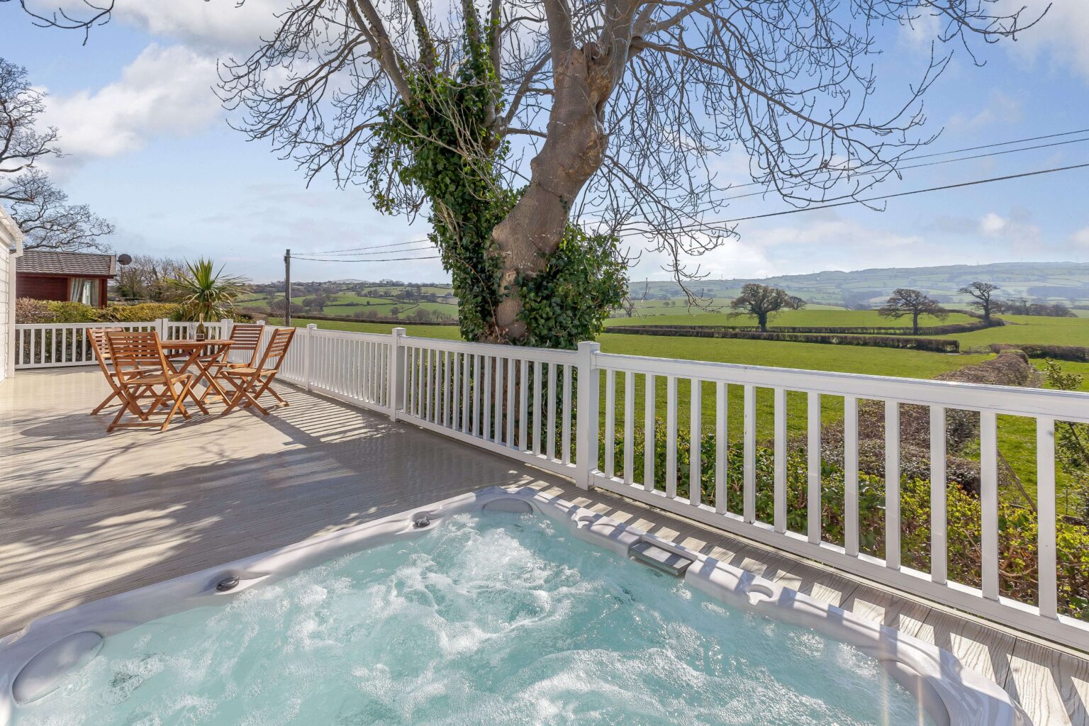 Admire stunning views of the surrounding Welsh valleys from your own private decking area when you stay in the luxurious Valley View Lodge at Tan Rallt.