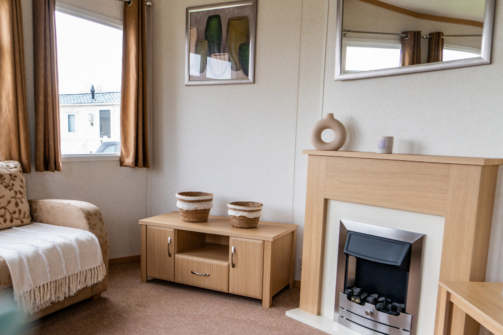 The Carnaby Melrose features a beautifully presented interior with a tranquil colour palette and large windows that create a bright and spacious feel throughout. The open-plan living area includes generous, comfortable seating alongside a charming feature fireplace, providing a cosy setting for cooler evenings.