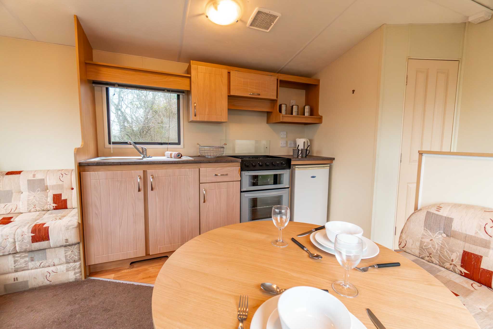 Perfect for couples or small families looking for comfortable, versatile holiday accommodation. Step inside to a bright and welcoming open-plan living space with comfortable seating, plenty of natural light and a practical layout that maximises every inch of space. The well-equipped kitchen offers good storage, worktop space and integrated appliances – ideal for preparing meals after a day enjoying the park.