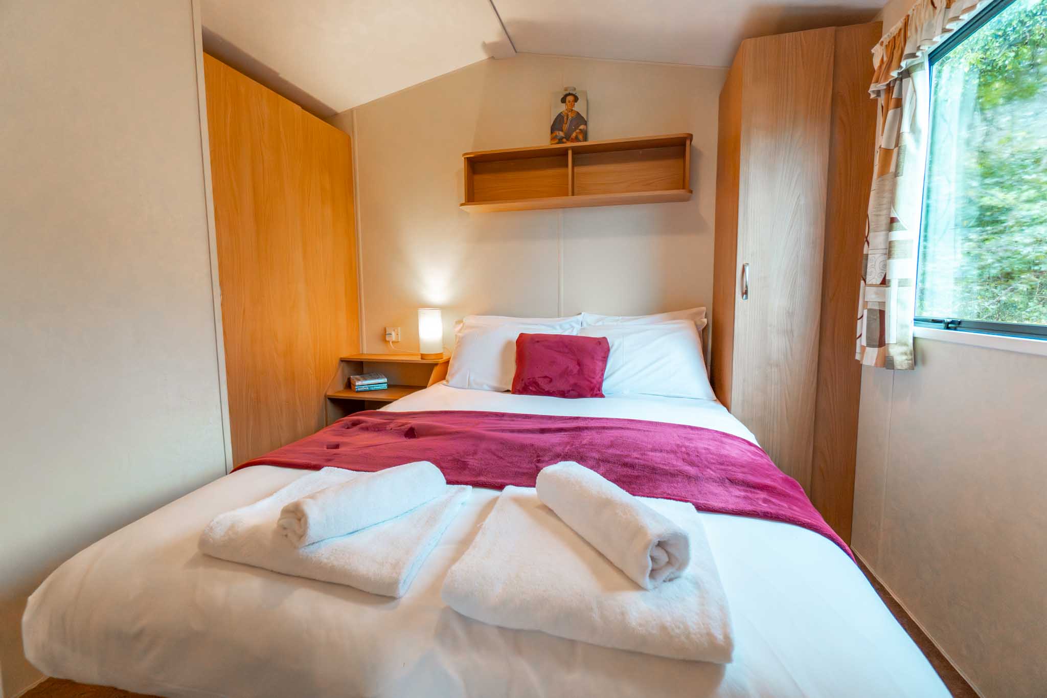 The cosy bedroom features a large double bed and built-in wardrobes for storage, while the cleverly designed layout also offers additional sleeping space for up to four people.