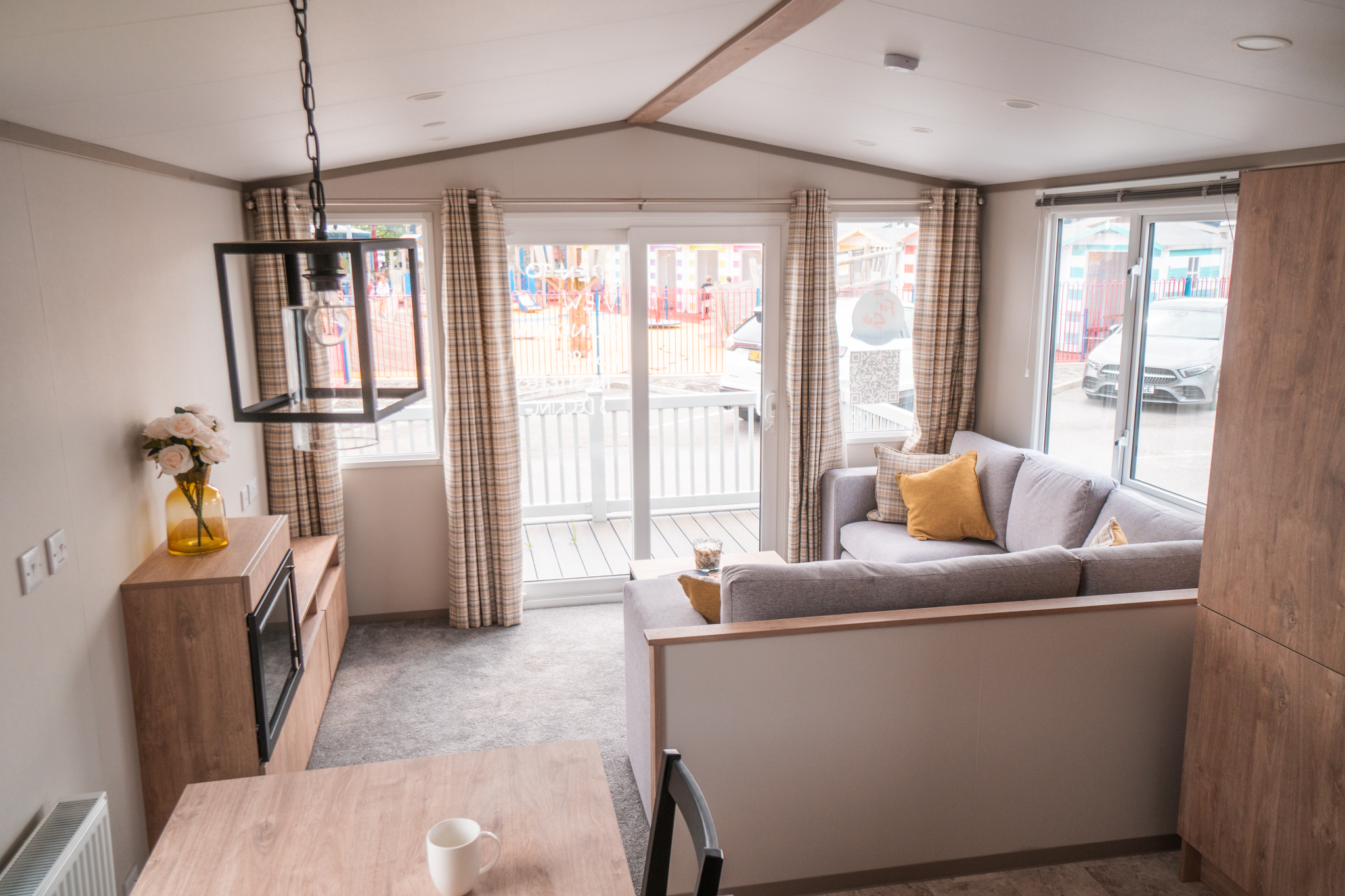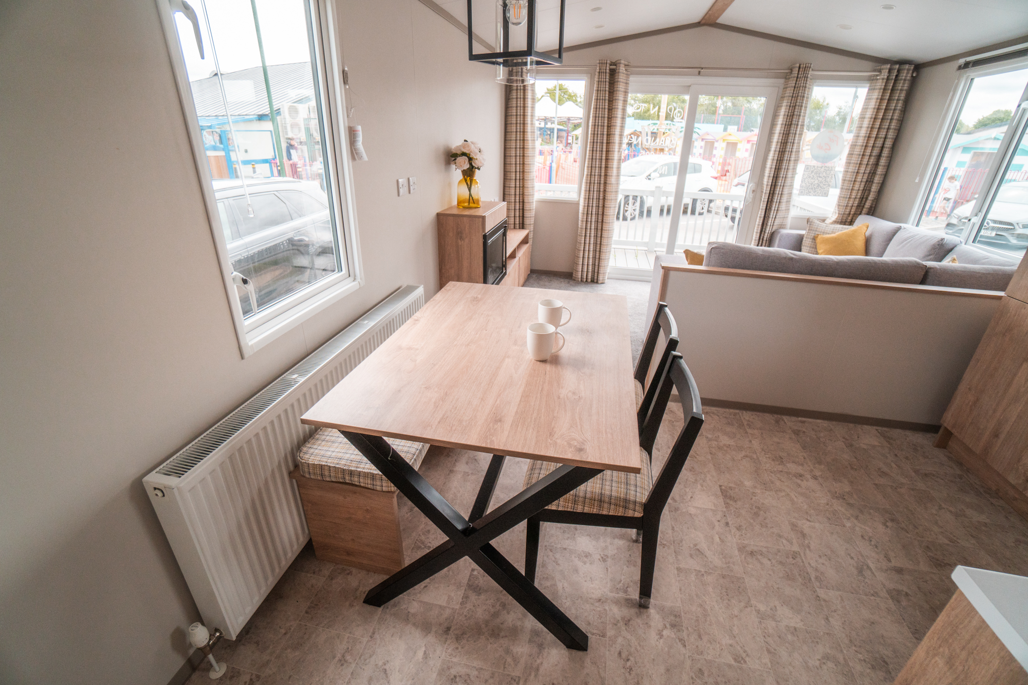 Designed around a modern L shaped sofa which doubles up as a pull-out bed, this comfortable and stylish living space is bursting with natural light from the wide front windows and for cosy nights in the electric fireplace becomes a great focal point.