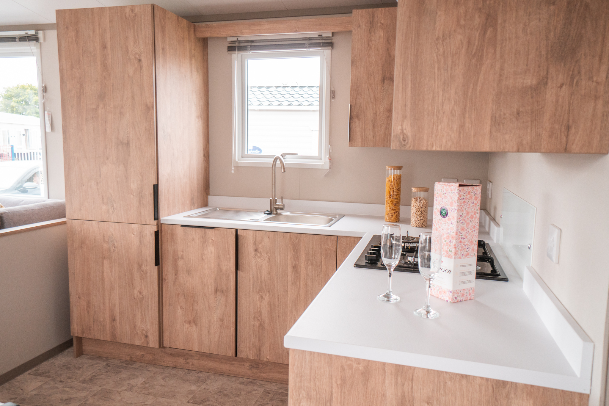 Family dining is ideal in the Stonewood kitchen, the low maintenance, stylish L shaped kitchen with its warm wooden tones offers a great amount of storage with all the kitchen essentials your guests expect and the dining table with matching bench seating is perfect for sitting around to enjoy mealtimes.