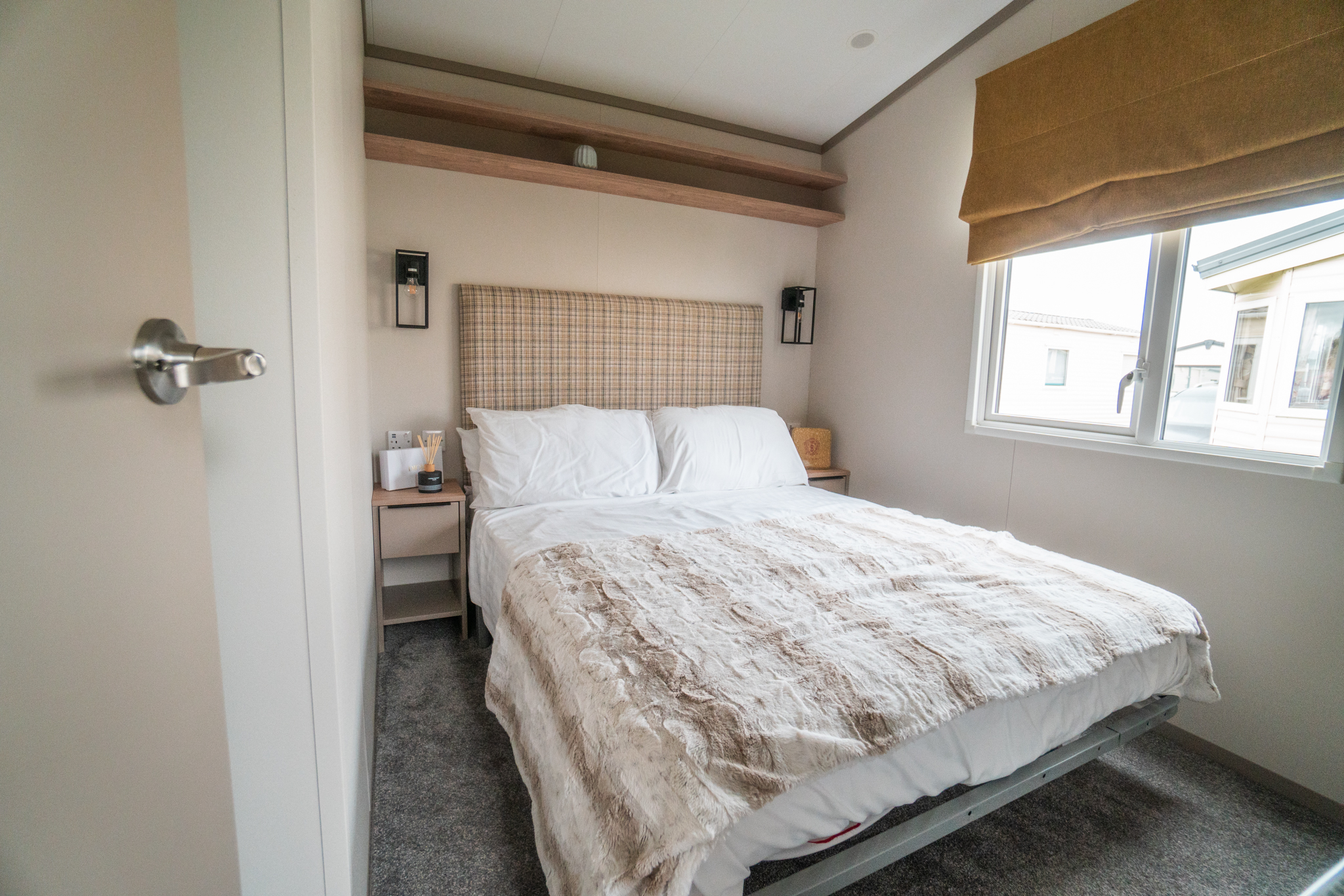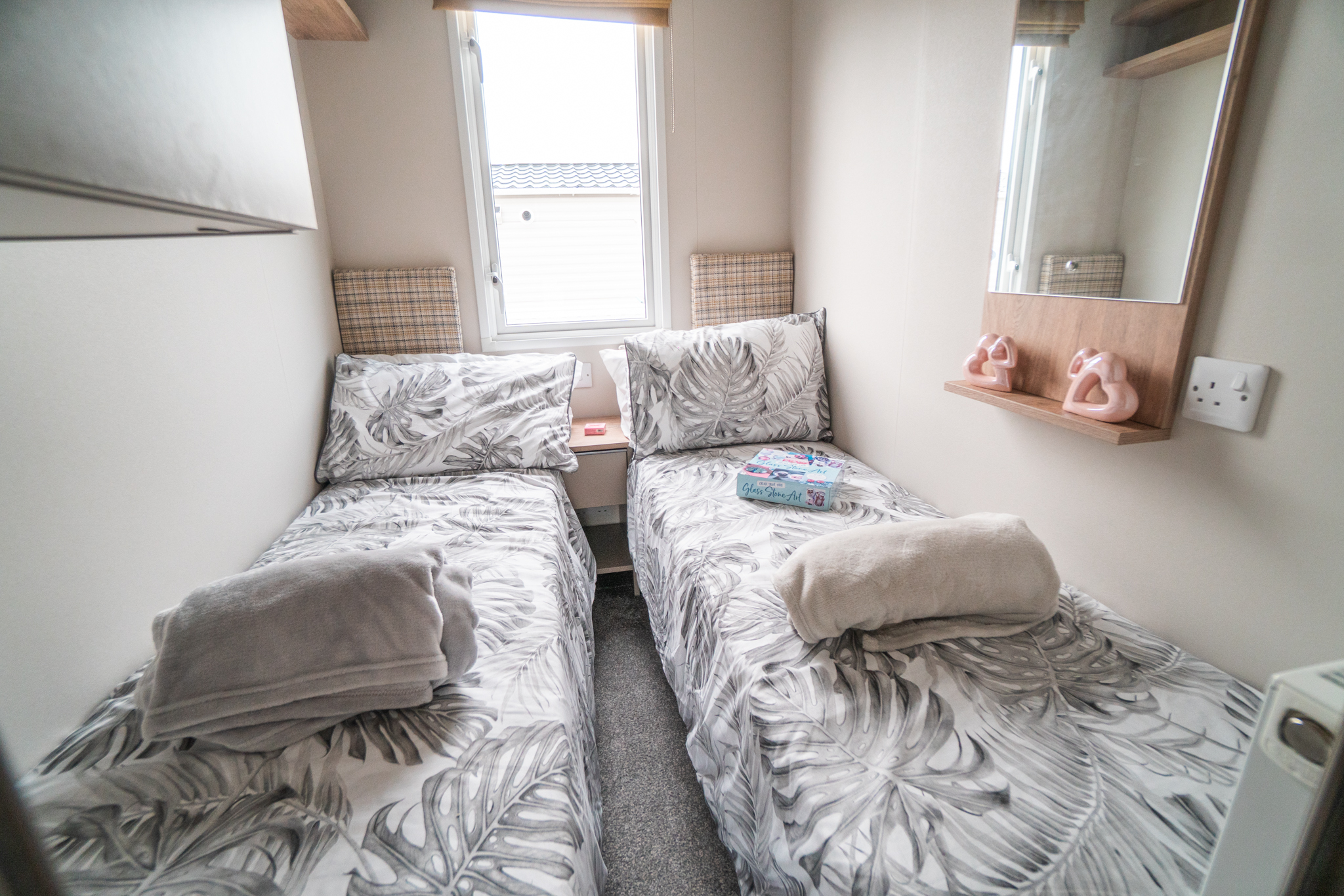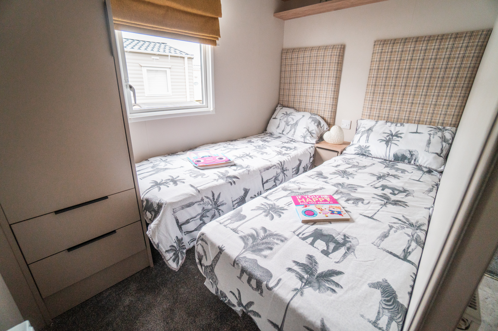 The cosy and relaxing master bedroom combines greys and yellows with natural wood tones and utilises space with great storage a mirrored dressing area and washroom. The same great design theme is continued through into the additional bedrooms, with twin beds and handy built-in storage.