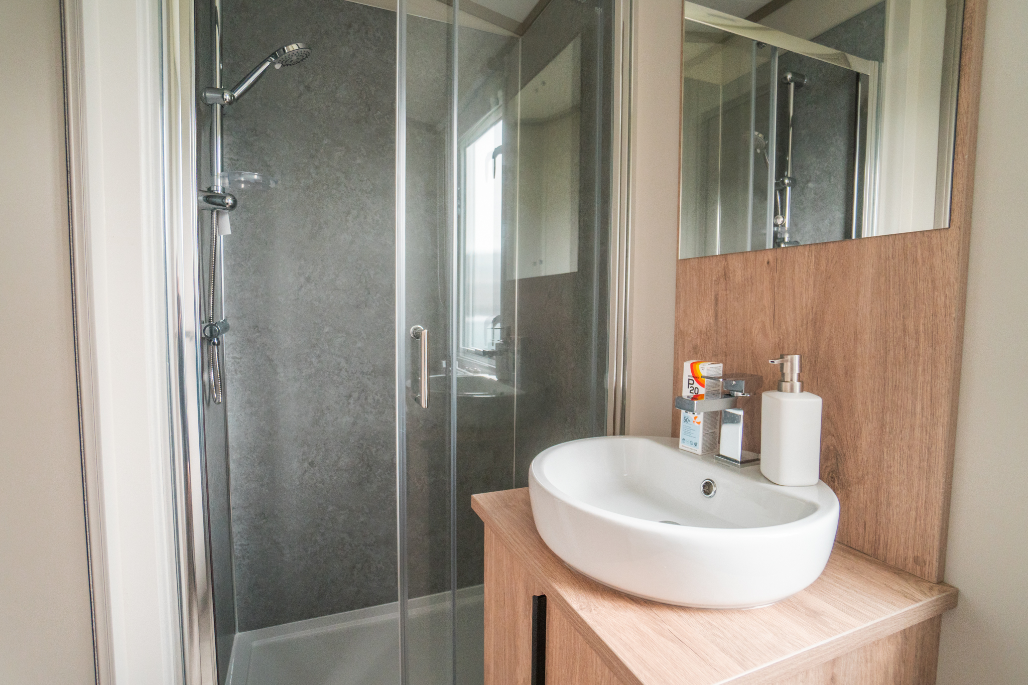 The easy to maintain main bathroom is light and airy, with a simplistic yet modern design, fitted with a large shower, basin with built in vanity cabinet and a coordinating splash back and mirror and close coupled ceramic toilet.