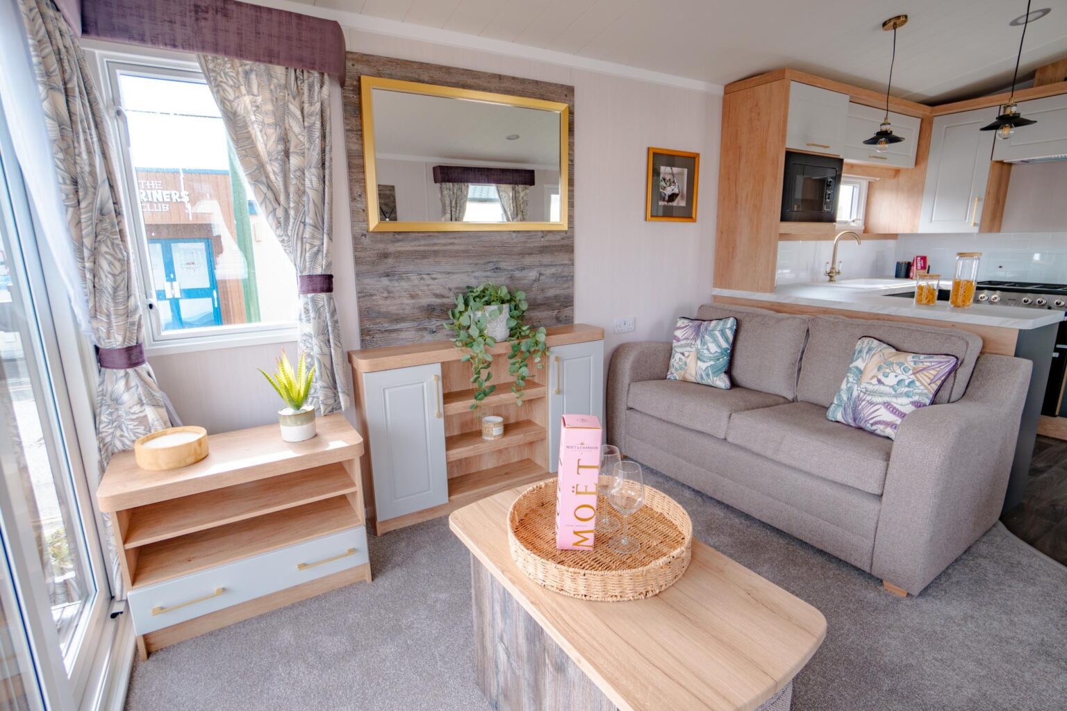 The Bayview holiday home offers a practical and stylish retreat for families. Featuring a spacious and airy living area with Carnaby crafted sideboard, cosy corner sofa, modern open-plan kitchen and dining area, and thoughtful design, perfect for memorable getaways.